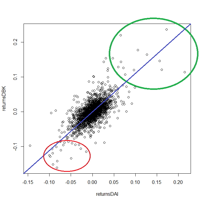 Moreover, even if the assets correlations are low, it may happen (and actually happens) that the assets grow more or less independently. But as soon as panic breaks out and everybody sells-sells-sells everything falls together (thus a diversification reaches its limits). Have a look at the scatter plot of Daimler's and Deutsche Bank's daily returns. Their correlation is 0.68, which is though strong but still would be acceptable. However, there is much more dependence as they fall than as they grow, so the diversification effect is insufficient.