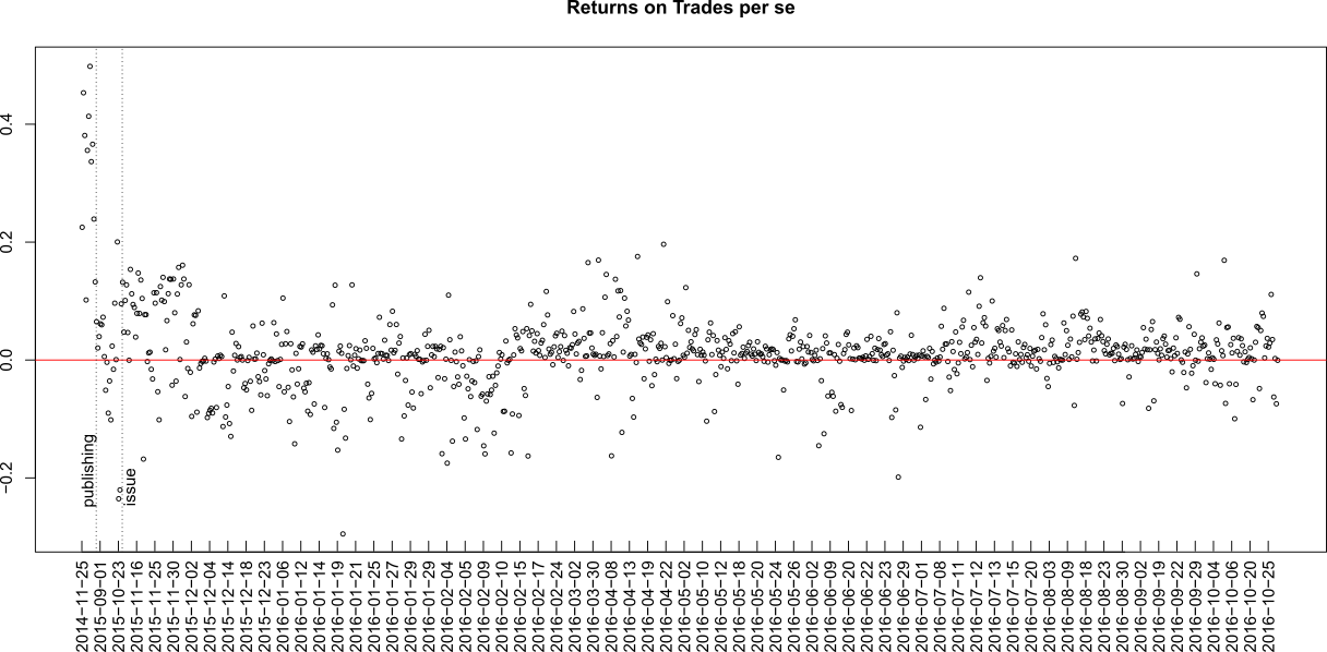 They are pretty homogeneous (and thus consistent!), however, a good eye might be caught with the fact that after the publishing and issuing I changed a trading approach: now there are more trades with a smaller absolute value of returns. Note that the scale of the axis X is not proportional: the timespan between two adjacent SELL-transactions is not constant, whereas the axis graduation is equidistant.